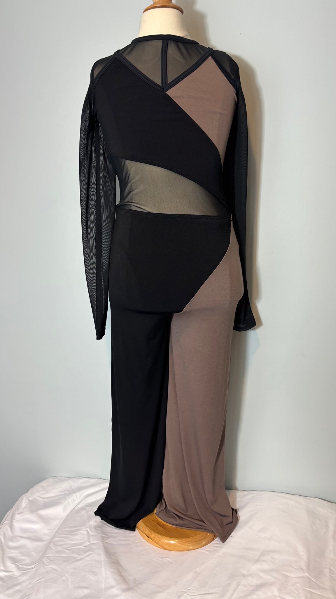 Weissman Costumes Black and mocha long sleeve jumpsuit with geometrical design, black mesh sleeves, black mesh at center and neck line, open back, closure behind neck, built in briefs, pant length is approximately ankle to mid leg.