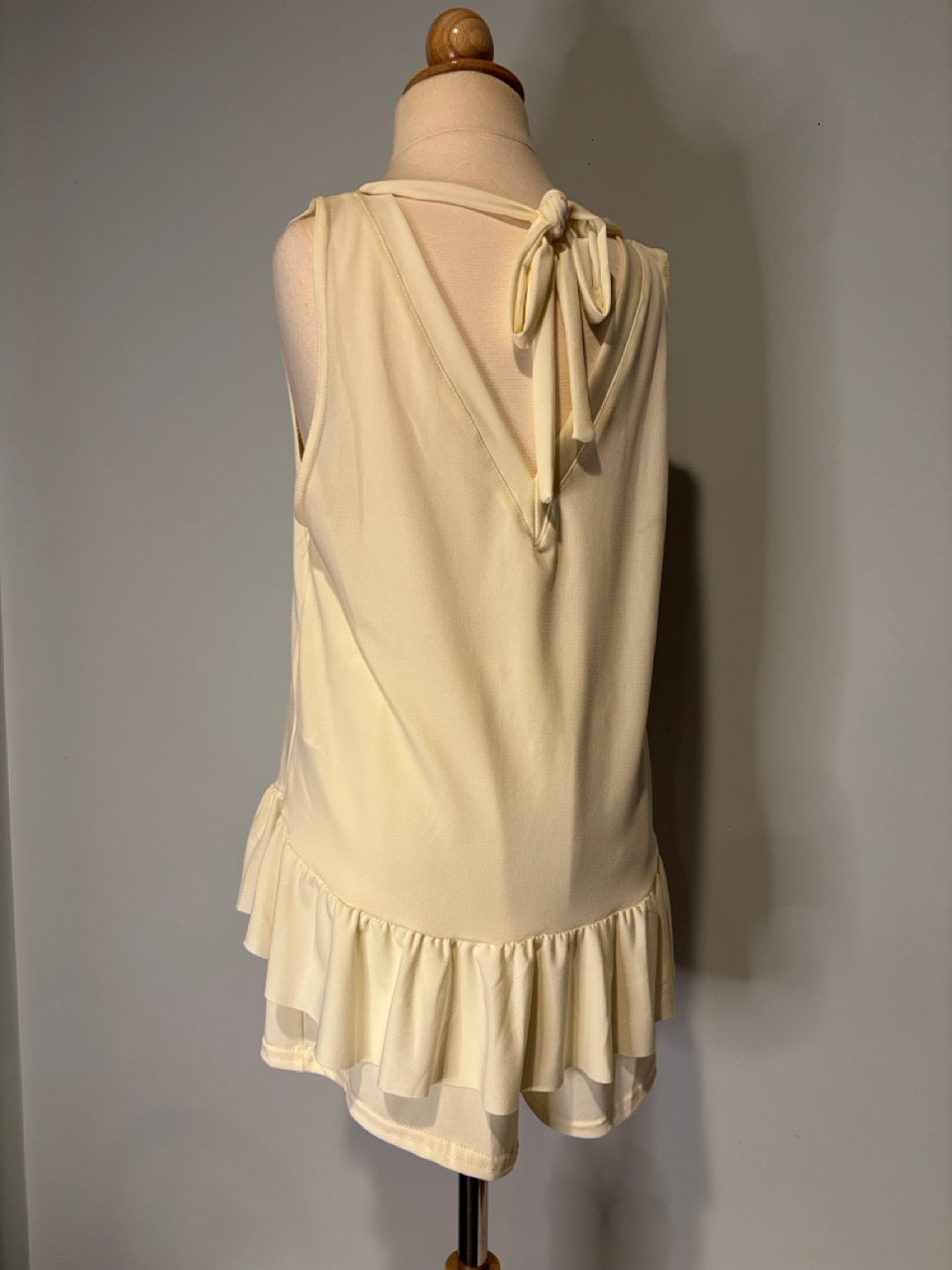 Sheer cream fly away tank that ties in back, subtle ruffle along bottom, matching cream shorts with built in briefs. Tank will need something under it due to its sheerness.